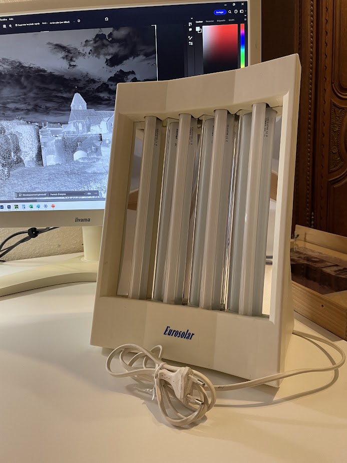 Pour vous donner un point de départ : avec ma lampe à tubes je place le papier à 11 cm, avec ma lampe à LED je suis passé à 22 cm.